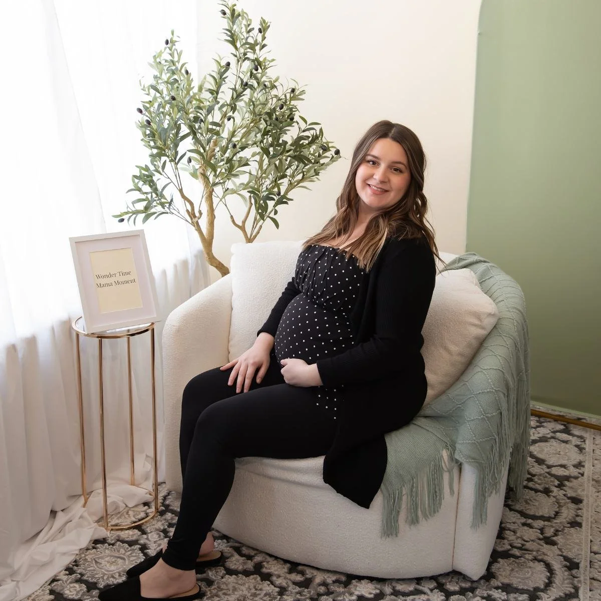 • Mama Moment Chair – A softly guided pause in our signature chair with 2–3 poses and a short vertical clip (filmed on your phone) and one 4×6 color print of your moment.