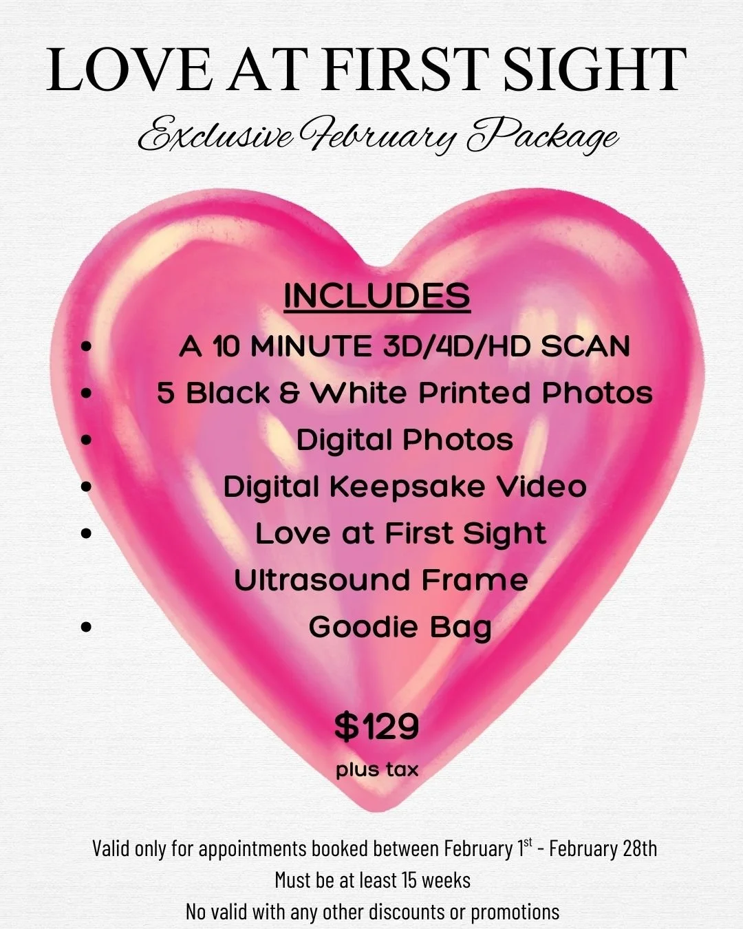 This package includes (5) Quick Peek Reassurance Scans for the price of 4! These can be done at any point throughout pregnancy. Not to be combined with any other offer.